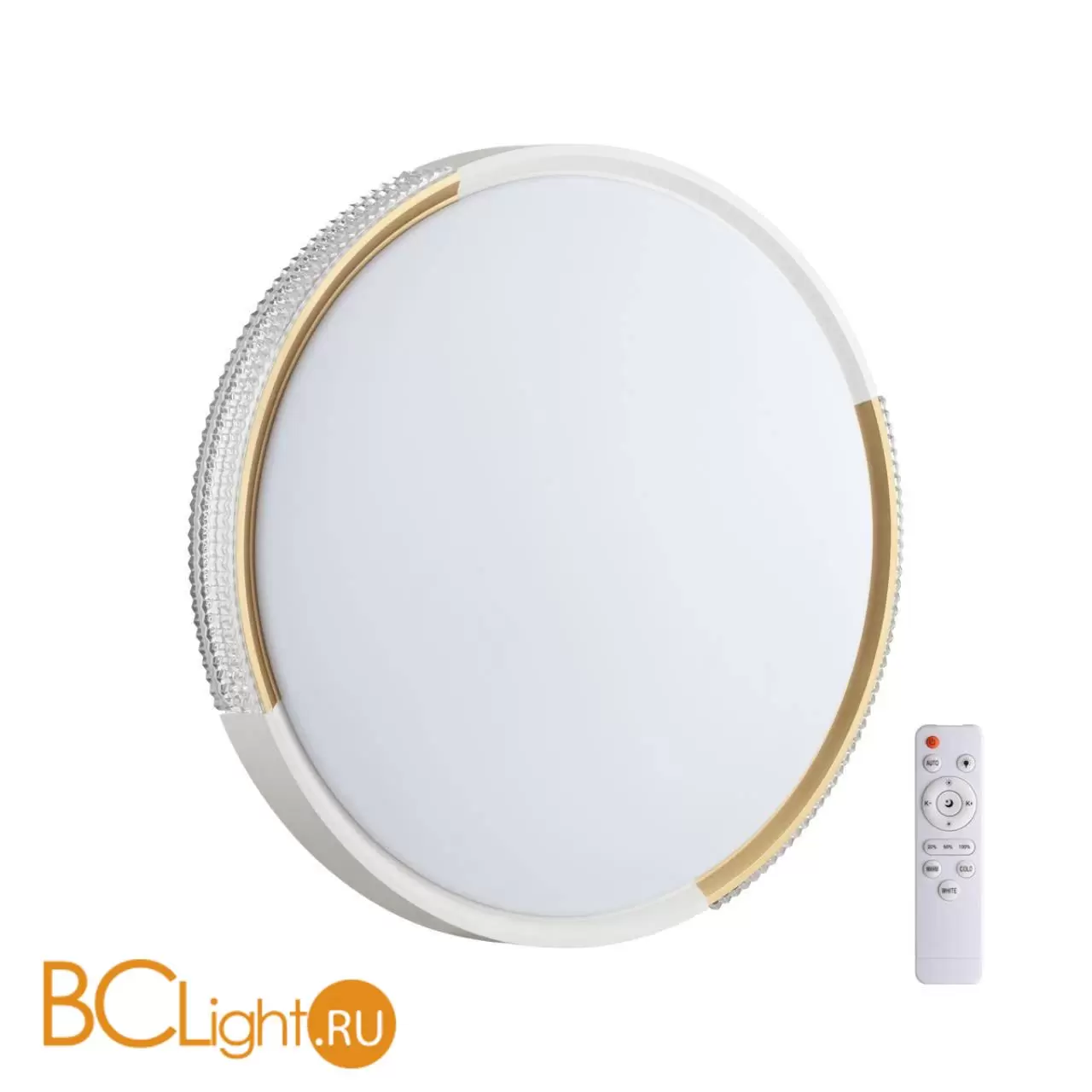 Светильник 7612/EL линии VELIO состоит из металлического основания (базы) и пластикового рассеивателя. Материал рассеивателя - качественный акрил белого цвета с матовой поверхностью, без текстуры. Пластик обеспечивает светильнику равномерное рассеивание и хорошее светопропускание. Форма плафона: круглая, декорирована ободом из пластика "под хрусталь" с золотистым элементом декора. Степень защиты IP43 позволяет использовать светильник в определенных зонах влажных помещений. В комплект входит заменяемый LED модуль с линзами, мощностью 72Вт, которая соответствует лампе накаливания 730Вт. А также пульт ДУ, с помощью которого осуществляется плавное изменение цветовой температуры 3000-6300К, изменение яркости, переход в режим переключения теплого/белого/холодного/ночного света. Светильник имеет функцию "память".