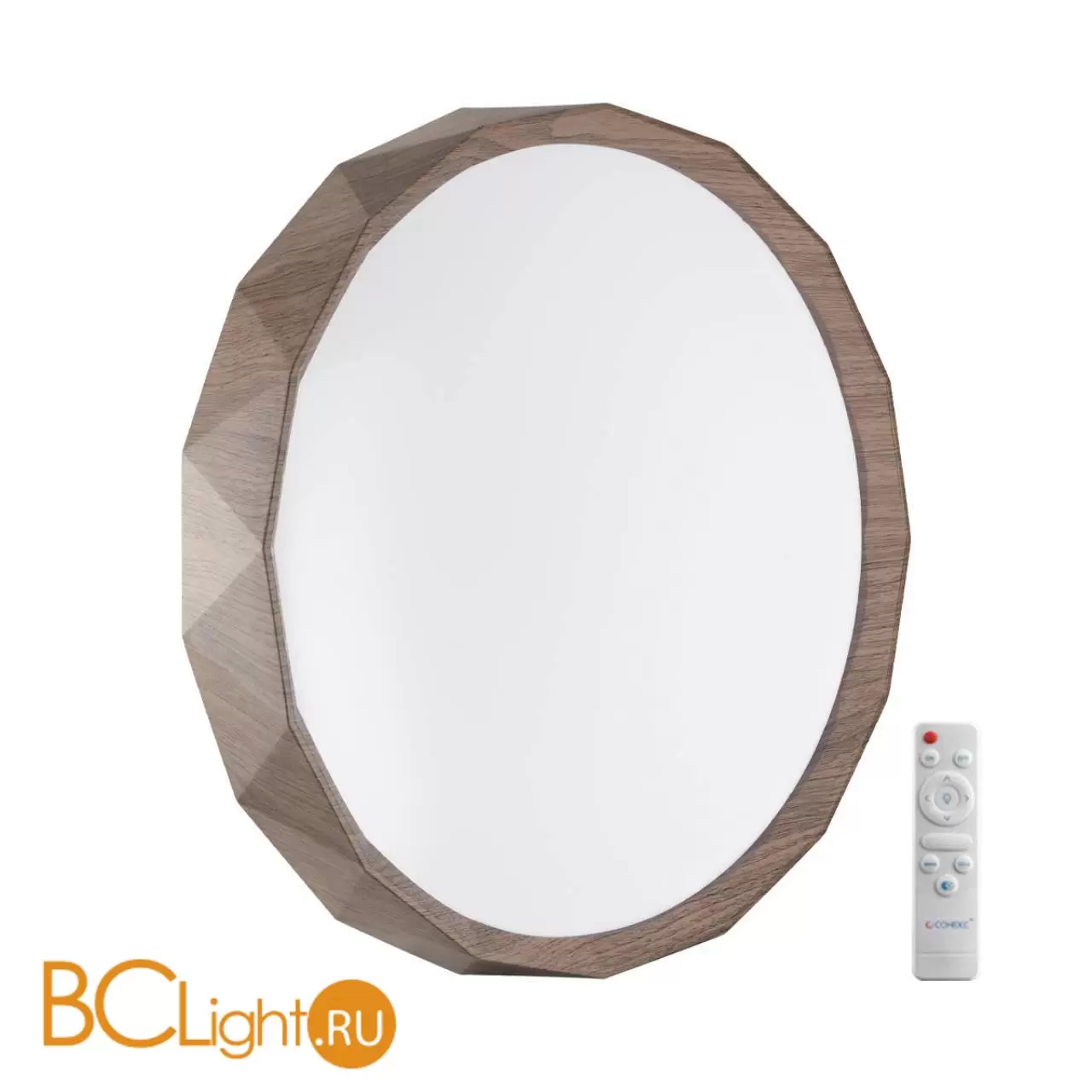 Светильник 7637/EL линии ZIF WOOD состоит из металлического основания (базы) и пластикового рассеивателя. Материал рассеивателя - высококачественный пластик марки PMMA 2.0 белого цвета с матовой поверхностью, обеспечивающий светильнику равномерное рассеивание и хорошее светопропускание. Форма плафона: круглая, декорирована ободом "под дерево" из пластика коричневого цвета. Степень защиты IP43 позволяет использовать светильник в определенных зонах влажных помещений. В комплект входит заменяемый LED модуль с линзами, мощностью 70Вт, которая соответствует лампе накаливания 610Вт. А также пульт ДУ (с креплением на стену), с помощью которого осуществляется плавное изменение цветовой температуры 3000-6000К, изменение яркости, переход в режим переключения теплого/белого/холодного/ночного света. Светильник имеет функцию "память".