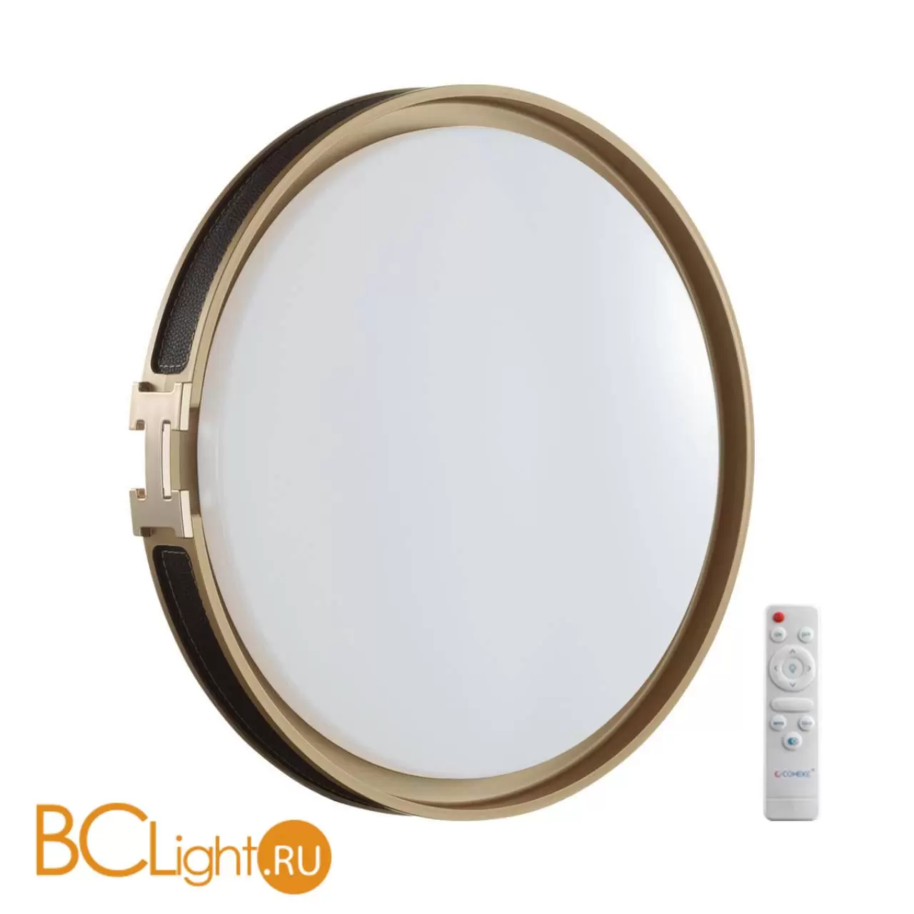 Светильник 7667/EL линии FAVEMO BLACK состоит из металлического основания (базы) и пластикового рассеивателя. Материал рассеивателя - высококачественный пластик марки PMMA 2.0 белого цвета с матовой поверхностью. Пластик обеспечивает светильнику равномерное рассеивание и хорошее светопропускание. Форма плафона: круглая, декорирована ободом из искусственной кожи черного цвета. Обод украшен декоративной вставкой в виде пряжки ремня из пластика, цвет золото. Степень защиты IP43 позволяет использовать светильник в определенных зонах влажных помещений. В комплект входит заменяемый LED модуль с линзами, мощностью 70Вт, которая соответствует лампе накаливания 610Вт. А также пульт ДУ (с креплением на стену), с помощью которого осуществляется плавное изменение цветовой температуры 3000-6000К, изменение яркости, переход в режим переключения теплого/белого/холодного/ночного света. Светильник имеет функцию "память".
