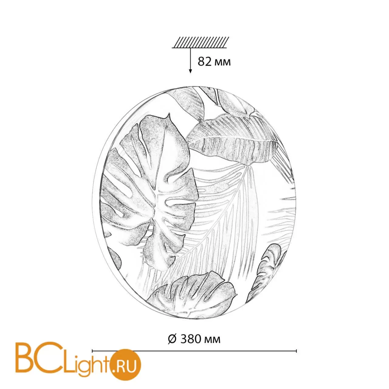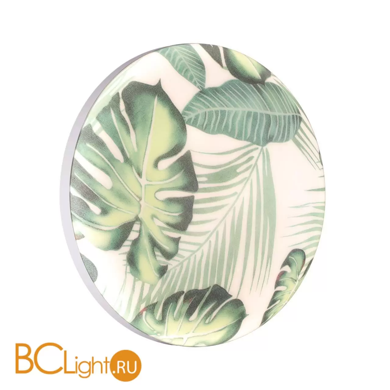 Светильник 7748/DL линии FLORI состоит из металлического основания (базы) и пластикового рассеивателя. Материал рассеивателя ― высококачественный пластик марки PMMA 2.0 белого цвета с глянцевой поверхностью, обеспечивающий светильнику равномерное рассеивание и хорошее светопропускание. Форма плафона: круглая, декорирована орнаментом на плафоне с зеленым рисунком тропических листьев и съемным ободом белого цвета. Рисунок на плафоне выполнен методом цифровой печати по технологии прямого нанесения красок на акриловый лист. С целью предотвращения выцветания красок поверх рисунка нанесен слой белой краски. После выдувания плафона при высоких температурах красочный рисунок приобретает стойкость и долговечность. Степень защиты IP43 позволяет использовать светильник в определенных зонах влажных помещений. В комплект входит заменяемый LED-модуль с линзами мощностью 48 Вт, которая соответствует лампе накаливания 440 Вт. А также пульт ДУ, с помощью которого осуществляется изменение цветовой температуры 3000-6000 К.
